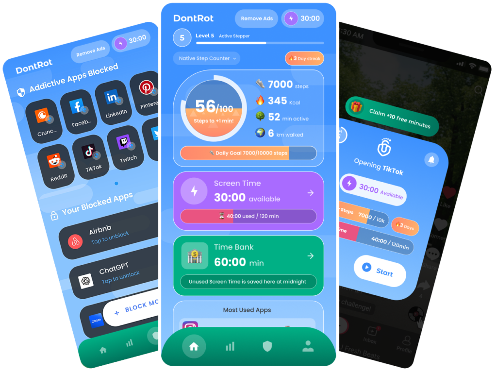 Block your addictive apps, access them with screen time earned walking.